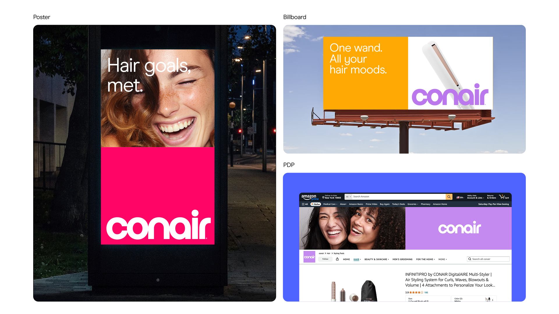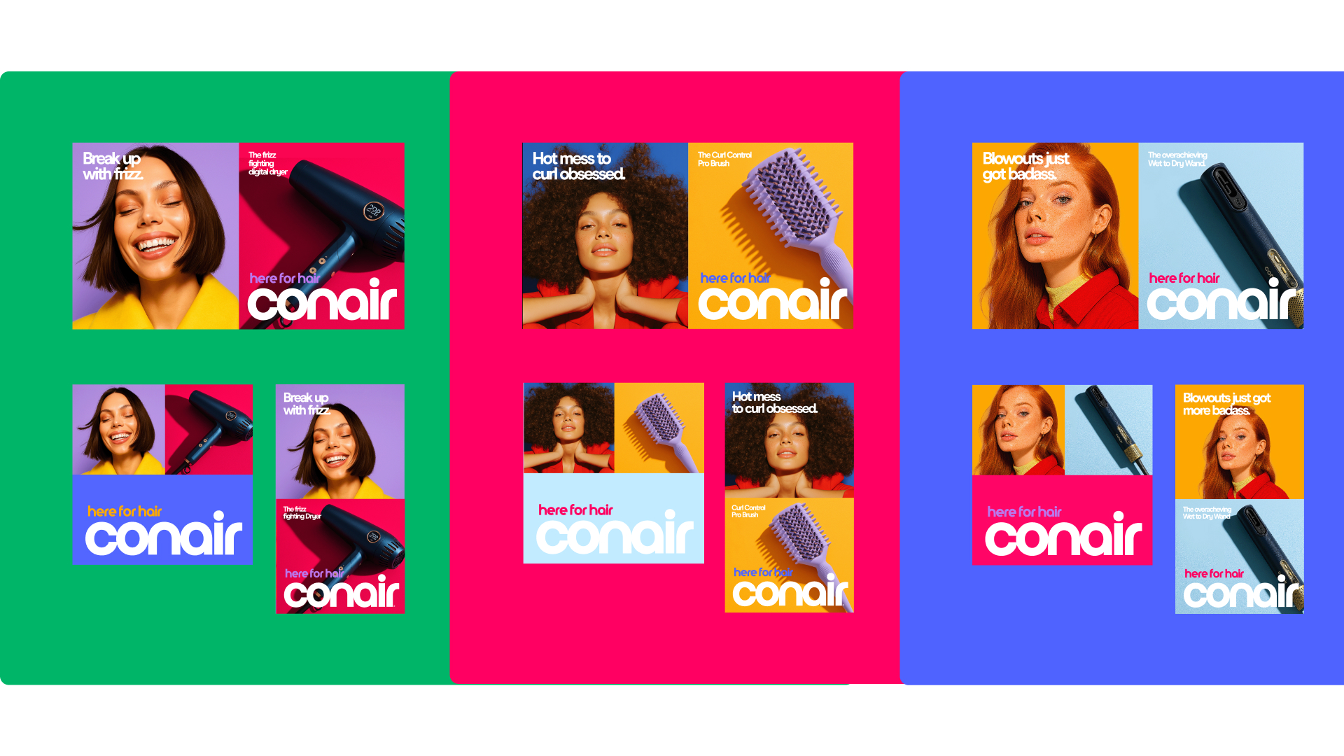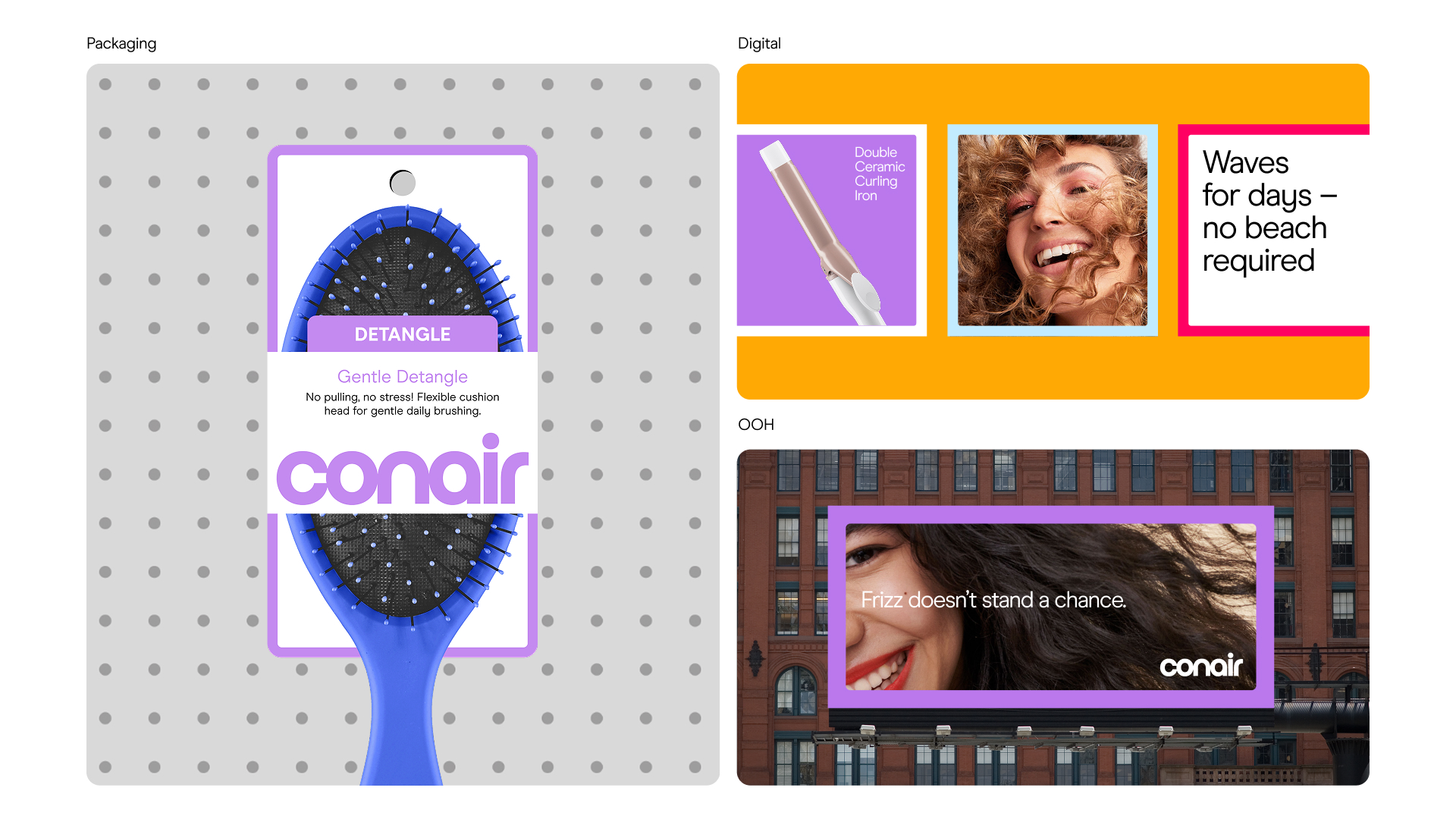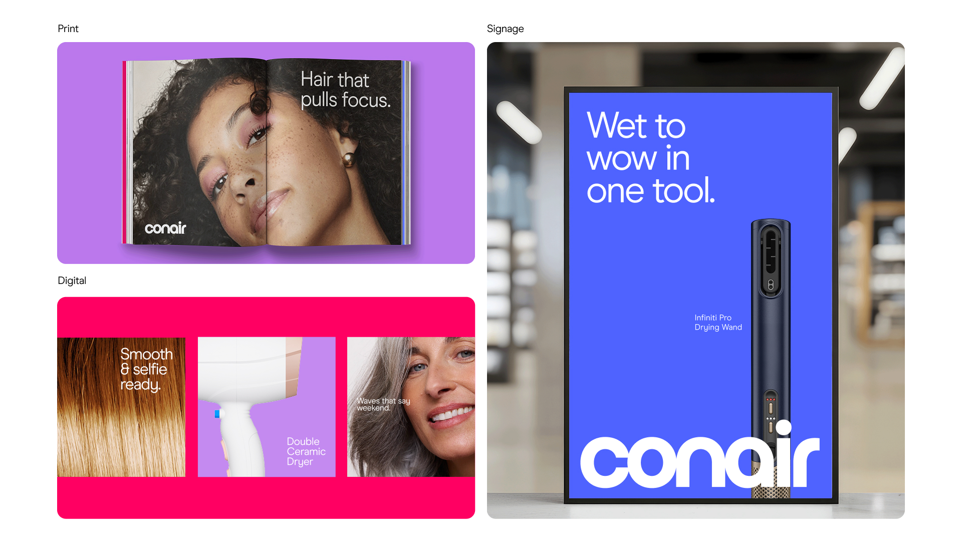 For Conair, a beauty pioneer that has been "Here for Hair" since 1959, we embarked on a comprehensive brand transformation to usher in a bold new era. This work repositions the iconic brand around its core audience: the modern muse, an exploratory spirit who is excited by possibility, demands quality, and influences through her confident openness to try new styles. Every facet of this redesign—from the evolved logo, dynamic color palette, and ownable typography to the cohesive art direction, packaging system, digital expression, and launch campaign—is crafted to resonate with her journey. The resulting ecosystem is both premium and approachable, designed to empower her exploration and firmly re-establish Conair as the essential, trusted companion for hair in a changing world.